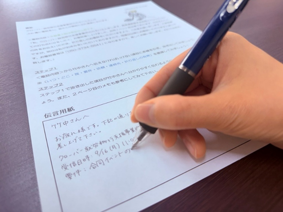 📞電話を取った後の伝言メモを想定した練習を行います。