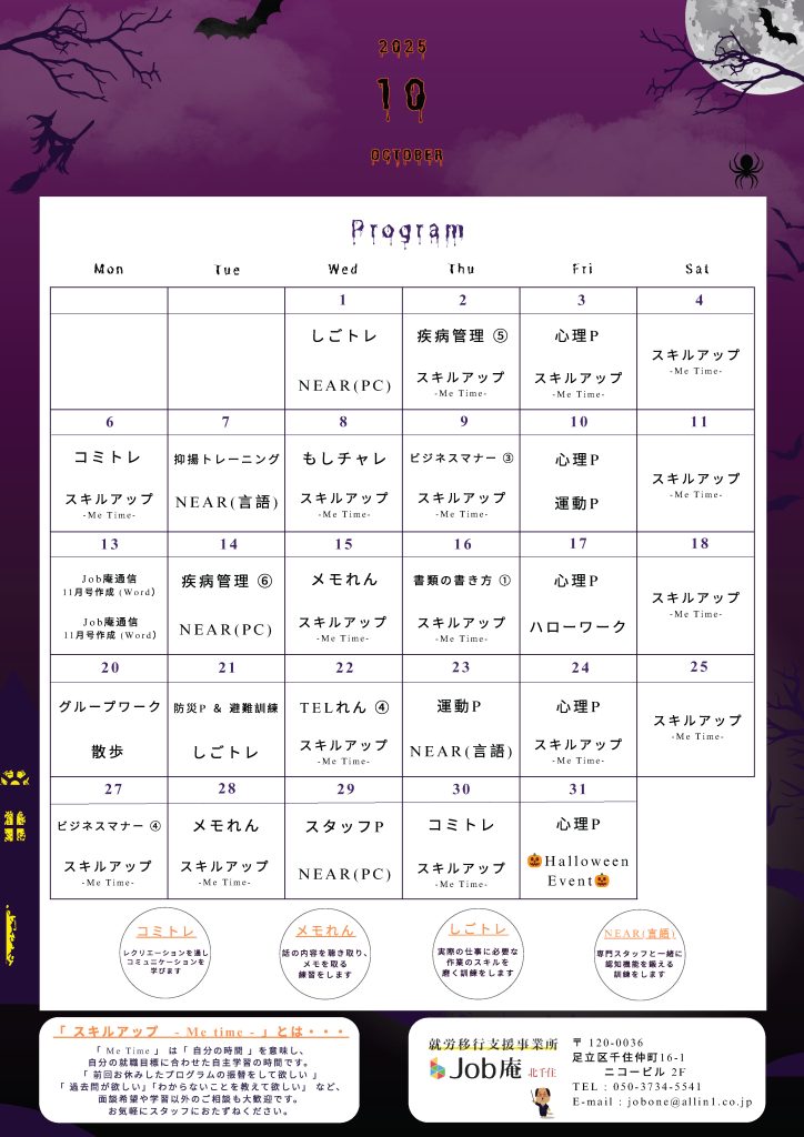 また、10月は体と心のバランスを整えるプログラムが充実しています。コミュニケーショントレーニングや認知機能を鍛えるプログラム、心理プログラム、メモ練習、散歩など多彩なプログラムをご用意📝
